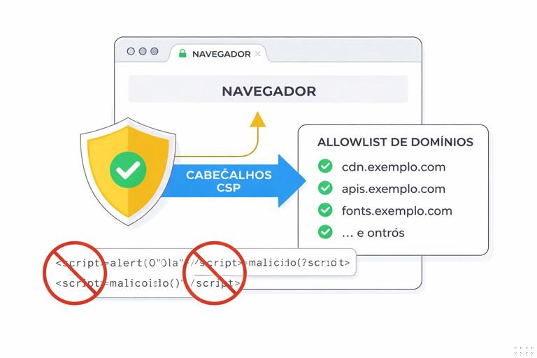 - Bloquear scripts inline e usar nonce/hashes quando necessário.