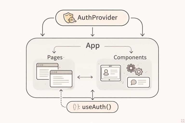 - AuthProvider: componente no topo da árvore que mantém estado e funções.