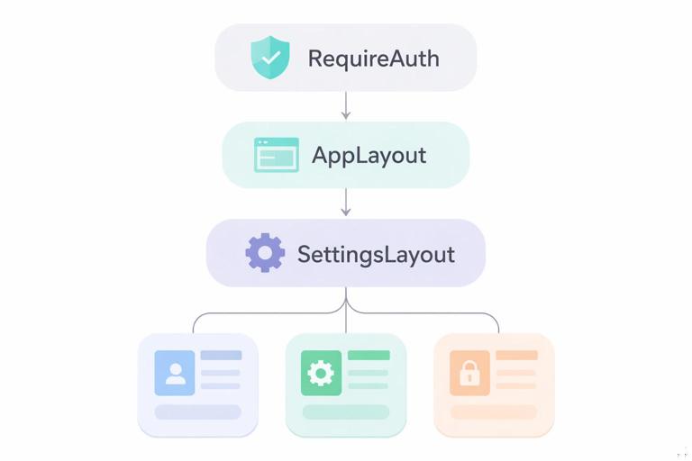 import { SettingsLayout } from "./pages/app/settings/SettingsLayout";import { SettingsGeneralPage } from "./pages/app/settings/SettingsGeneralPage";import { SettingsSecurityPage } from "./pages/app/settings/SettingsSecurityPage";import { SettingsBillingPage } from "./pages/app/settings/SettingsBillingPage";{ path: "/app", element: <AppLayout />, children: [ { index: true, element: <DashboardPage /> }, { path: "profile", element: <ProfilePage /> }, { path: "settings", element: <SettingsLayout />, children: [ { index: true, element: <SettingsGeneralPage /> }, { path: "security", element: <SettingsSecurityPage /> }, { path: "billing", element: <SettingsBillingPage /> } ] } ]}Com isso, você tem três níveis de composição: RequireAuth, AppLayout, SettingsLayout e a página final.