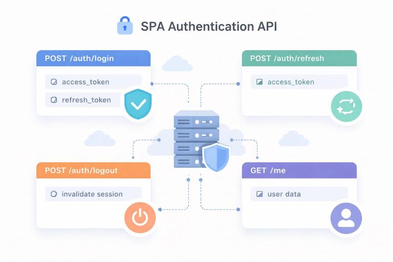 Mesmo que você já tenha um backend, vale explicitar os contratos esperados para alinhar a implementação do front-end. Um conjunto típico inclui endpoints de login, refresh, logout e me.