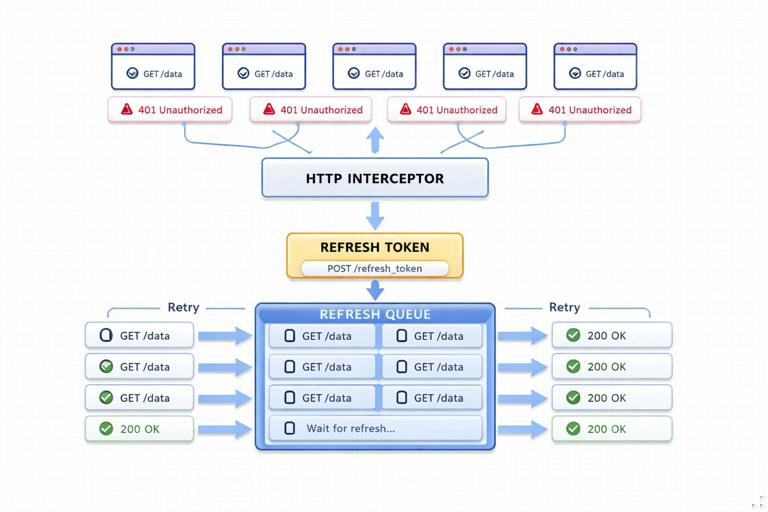 );O detalhe importante é usar uma variável de fila para evitar múltiplos refresh simultâneos quando várias requisições falham ao mesmo tempo.